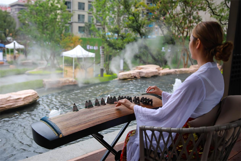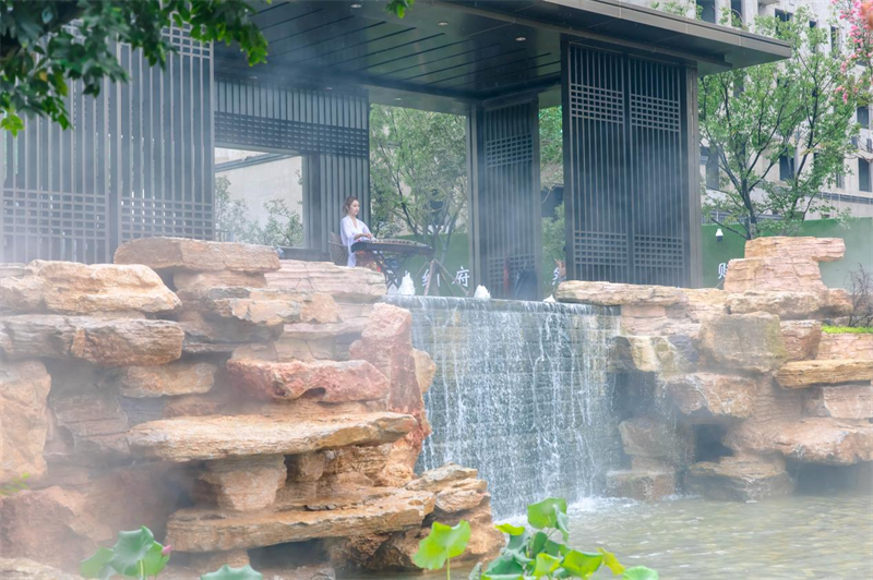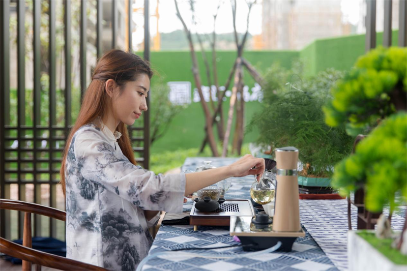 The Xin Lake was hidden in the clouds and mists, while the Lying Rainbow Bridge was telling an old but beautiful story. In the Chinese garden, the beautiful lady in the exquisite ancient clothes was like a painting, performed the intoxicating music, presenting the oriental charm and styles of the demonstration zone completely. In the Lansheng Room, the well-prepared tea ceremony engaged the guests, who appreciated the tea and the view in leisure.