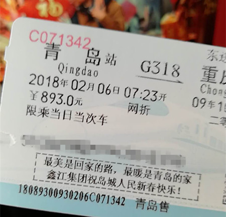 所有青島站始發的列車票上,都印上了鑫江集團對游子們的祝福。