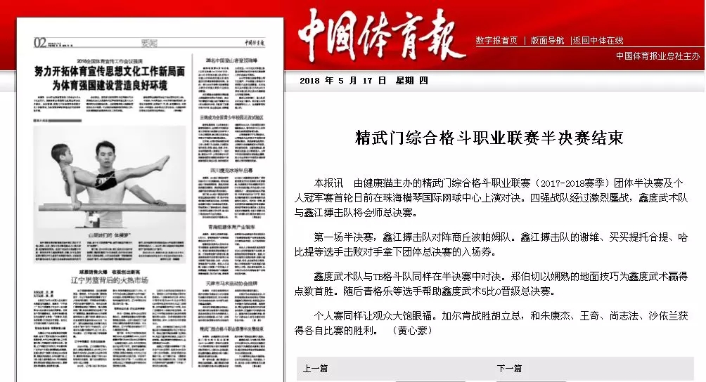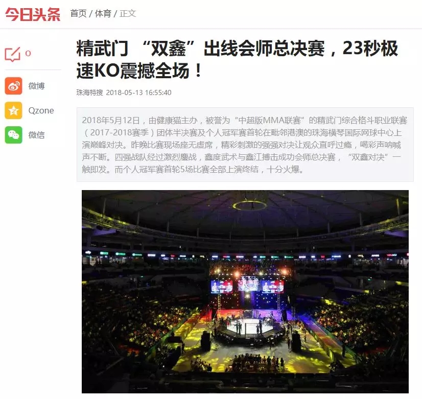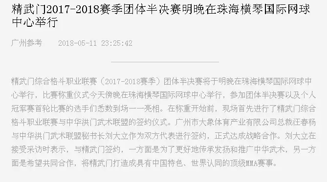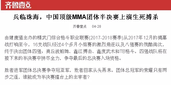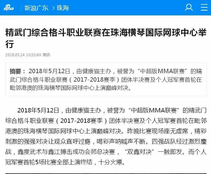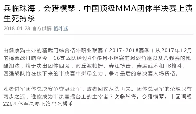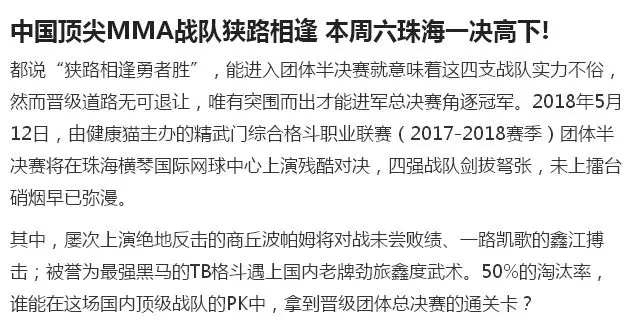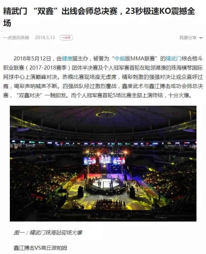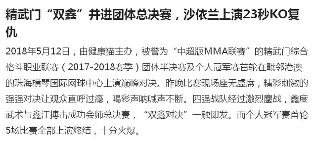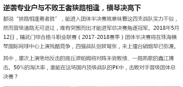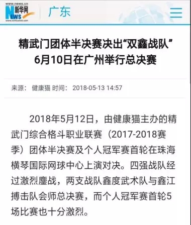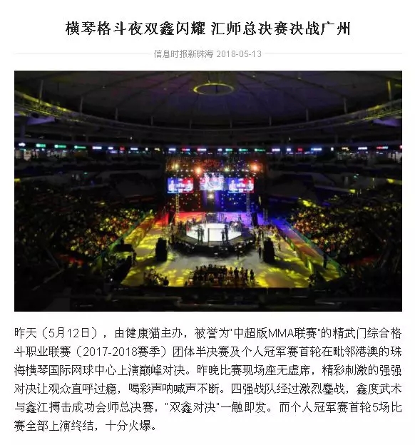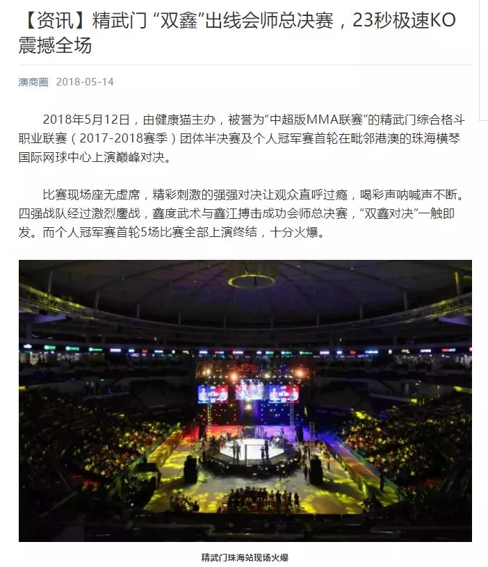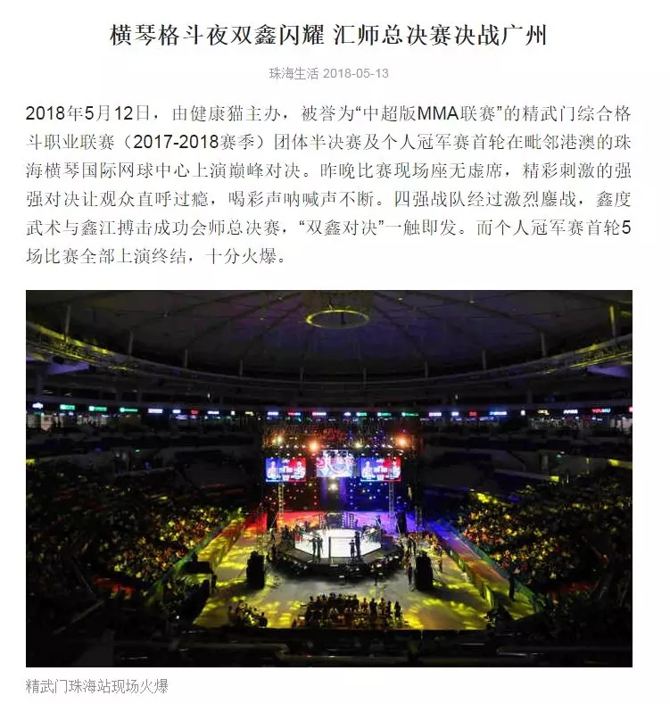 2018年5月12日,精武門綜合格斗職業(yè)聯(lián)賽(2017—2018賽季)團(tuán)體半決賽在珠海橫琴國際網(wǎng)球中心圓滿落幕。鑫江搏擊3:2險勝商丘波帕姆,成功拿到團(tuán)體總決賽的入場券。
