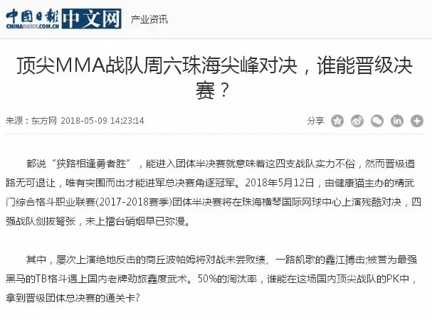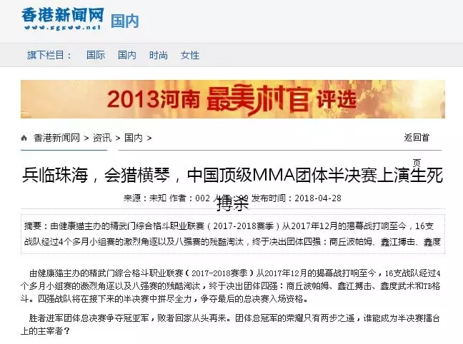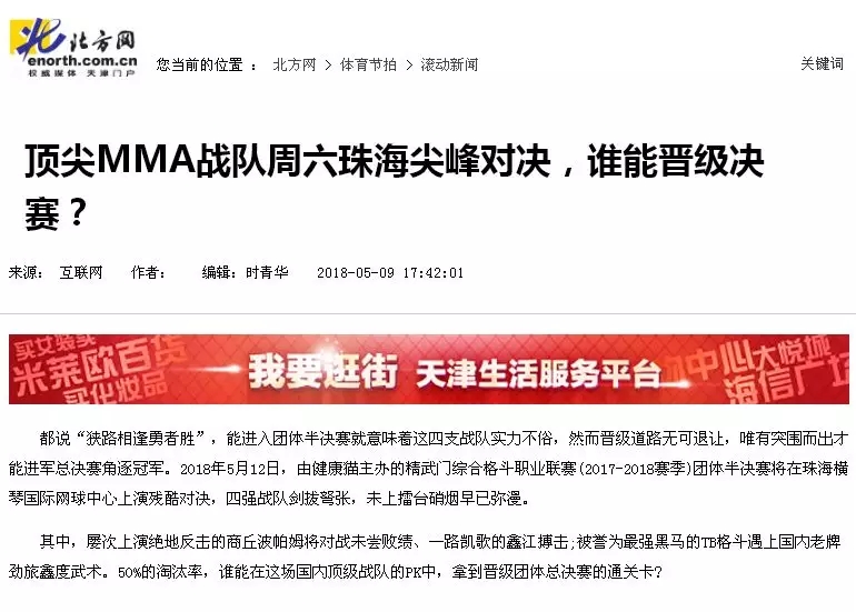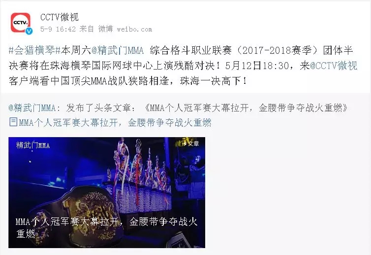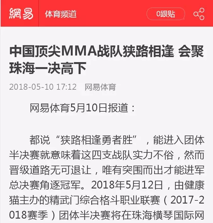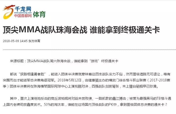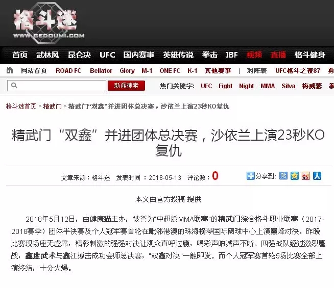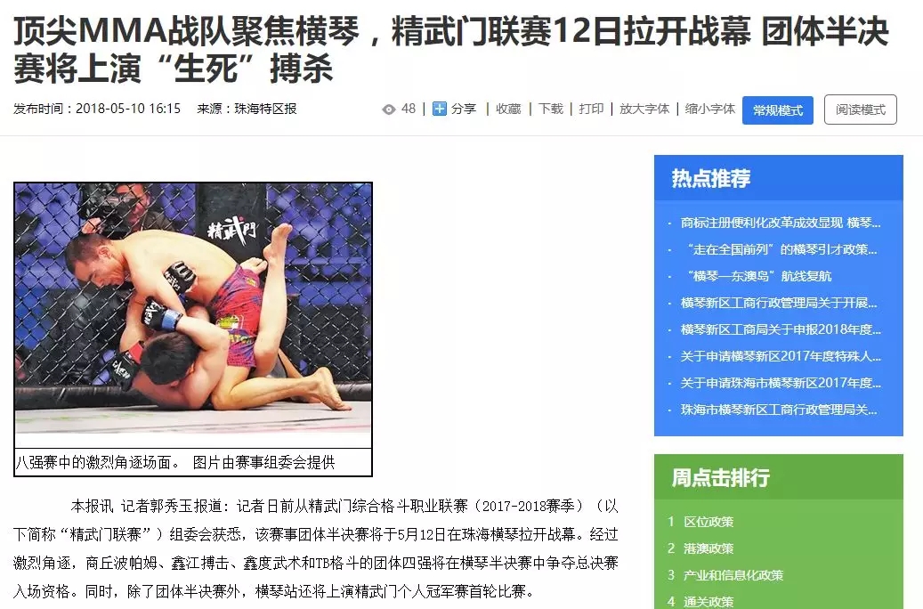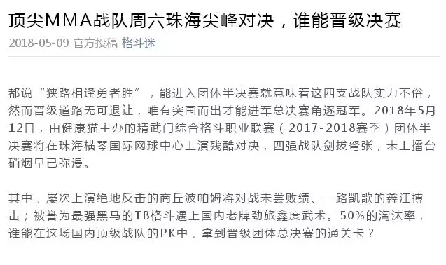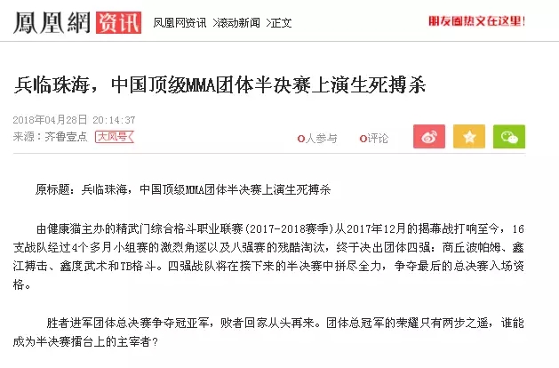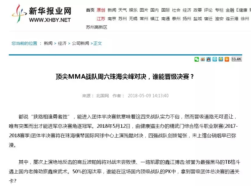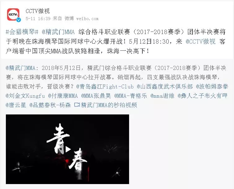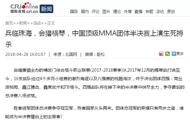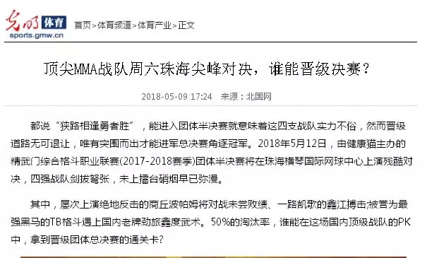 2018年5月12日,精武門綜合格斗職業(yè)聯(lián)賽(2017—2018賽季)團(tuán)體半決賽在珠海橫琴國際網(wǎng)球中心圓滿落幕。鑫江搏擊3:2險勝商丘波帕姆,成功拿到團(tuán)體總決賽的入場券。