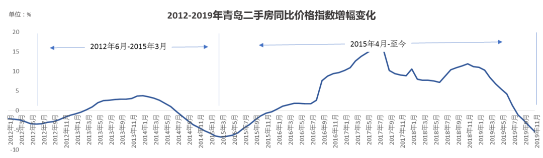 其實,發現市場的機會點也不難,上面這張圖是國家統計局公布的青島二手房價格指數的變化,這其中有兩個周期,2012年3月到2015年3月是一個波動周期,2015年4月至今是第二個波動周期,目前已經接近第二個周期的底部。
